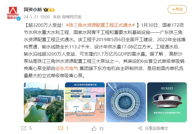 【超3200萬人受益!#珠三角水資源配置工程正式通水#】1月30日,國家172項節(jié)水供水重大水利工程、國家水網(wǎng)骨干工程和重要水利基礎(chǔ)設(shè)施——廣東珠三角水資源配置工程正式通水。該工程于2019年5月6日全面開工建設(shè),2022年全線盾構(gòu)貫通,輸水線路全長113.2千米,設(shè)計年供水量17.08億立方米。工程通水后,輸水沿線超3200萬人受益,可支撐約1.7萬億元GDP的需水量。據(jù)了解 ,高新沙泵站是珠江三角洲水資源配置工程三大泵站之一,其裝設(shè)的6臺套立式單級單吸蝸殼離心泵全部由@東方電氣集團旗下東方電機自主研制供貨,是目前國內(nèi)單機流量最大的立式單級單吸離心泵。