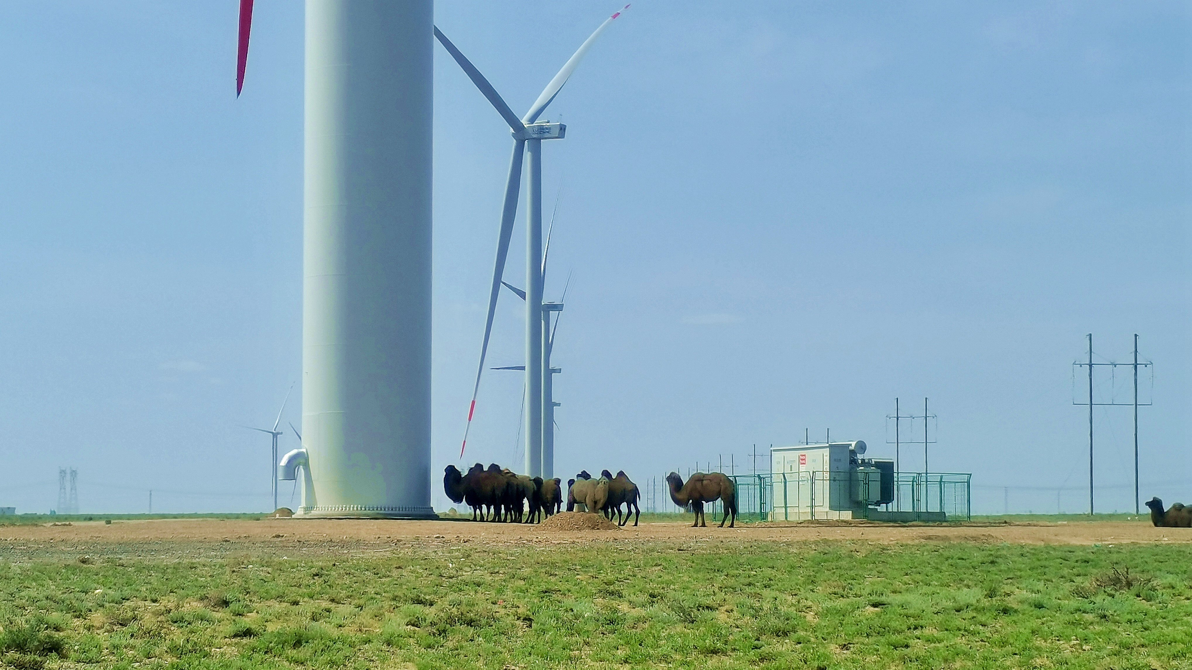 在大美新疆,東方風電為克拉瑪依源網荷儲一體化250兆瓦風電項目提供46臺風電機組。成群的駱駝在東方風機下安心休憩。