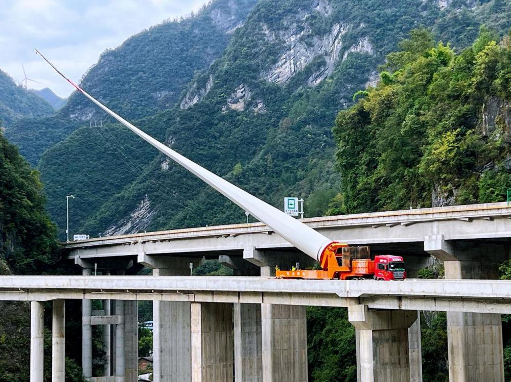 2021年11月,葉片揚舉車執(zhí)行重慶市石柱石家風(fēng)電項目運輸。(東方電氣資料圖片)