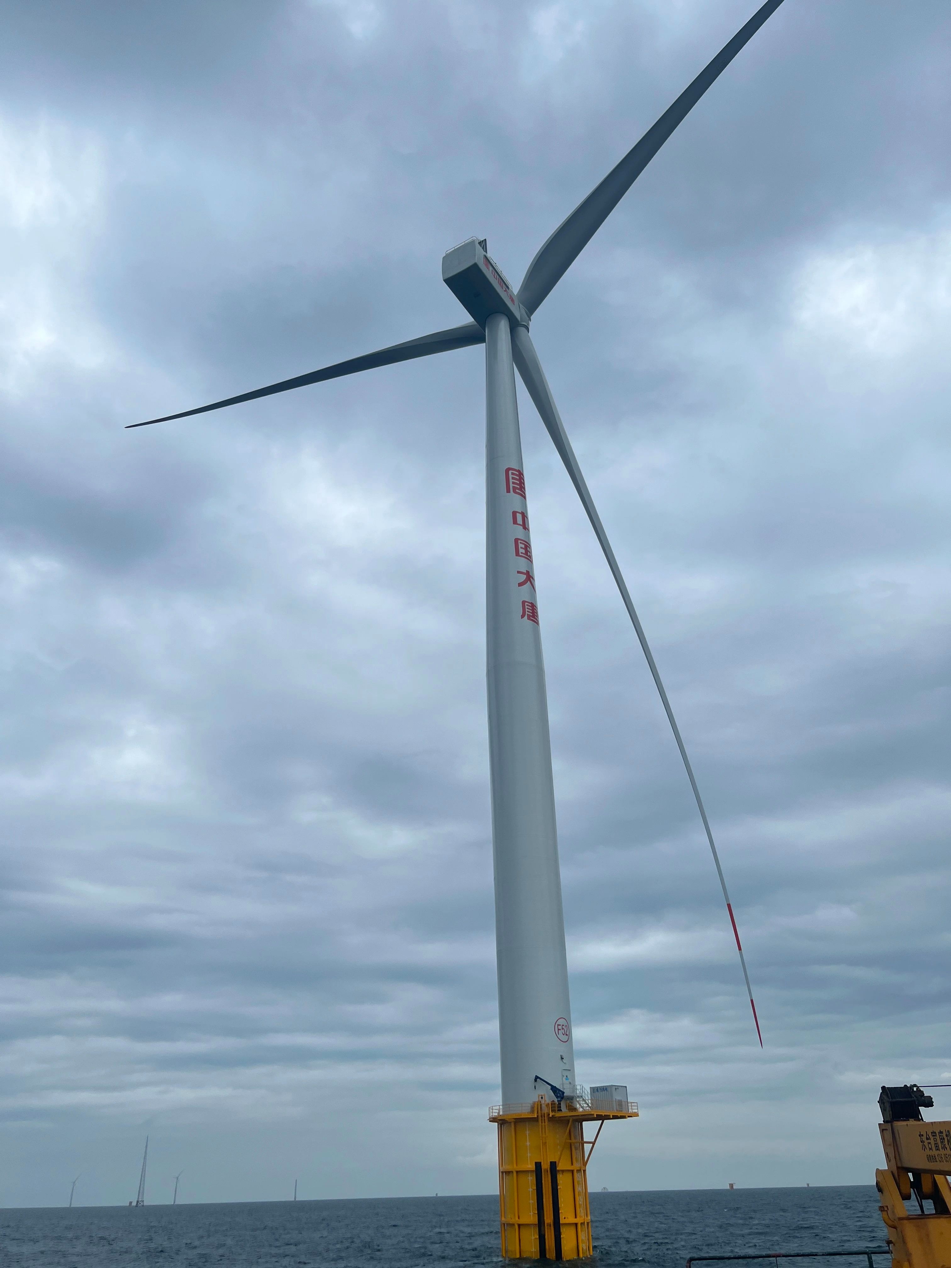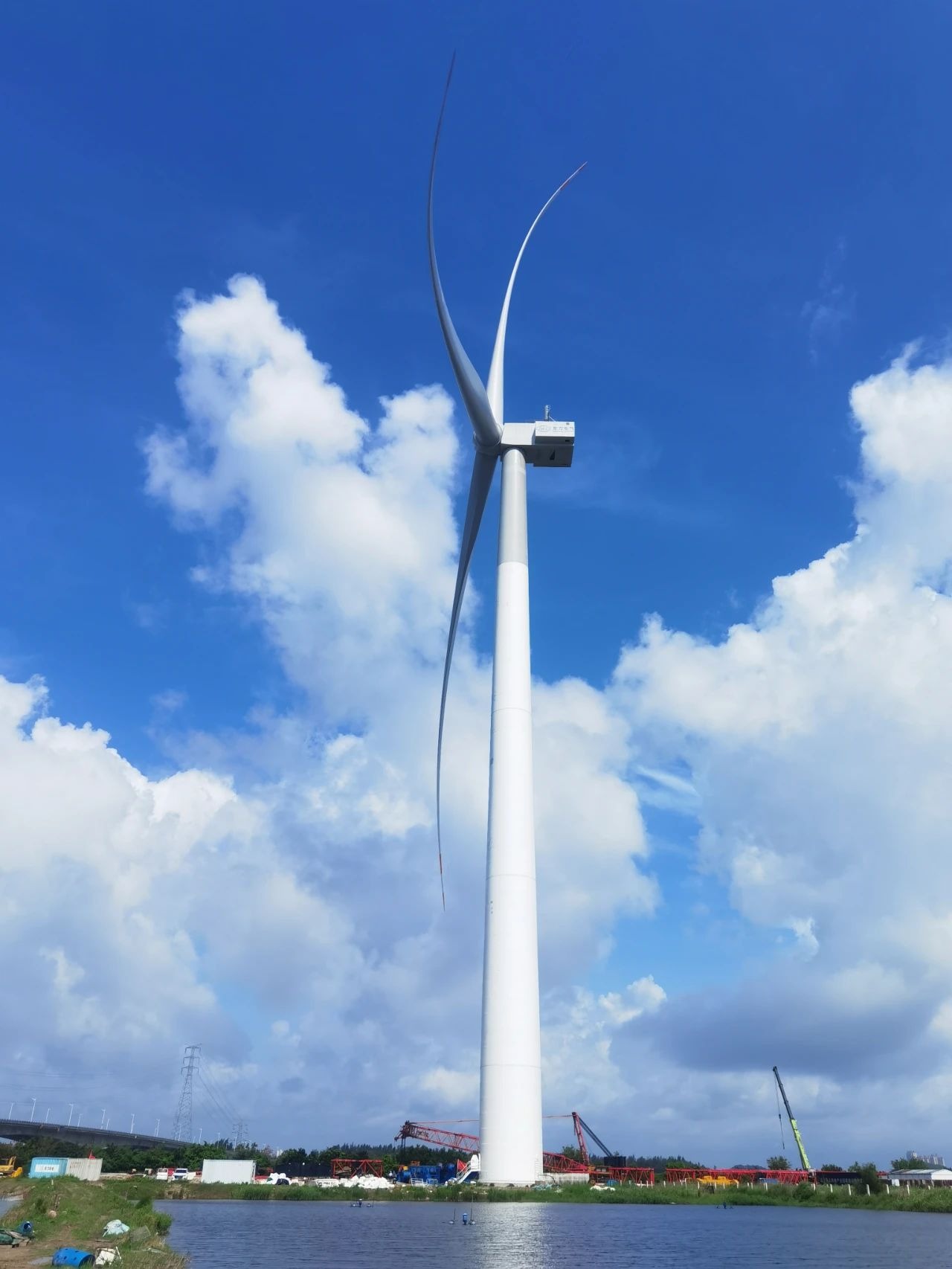 東方電氣自主研制的18兆瓦半直驅海上風電機組,是全球在運最大海上風電機組,機組設計、控制策略、機組及部套可靠性進一步優(yōu)化提升,具備超強的抗臺風能力。該機組安裝的126米葉片,解決了超長柔性葉片可靠承載技術難題,并基于約束進化算法,實現(xiàn)了葉片的氣動性能和載荷重量的最佳匹配,一體化葉片成型工藝,保證葉片在臺風中有超強表現(xiàn)。該機組塔筒專為抗臺風定制化設計,充分考慮抗臺風要求,具有抵御17級及以上臺風能力。