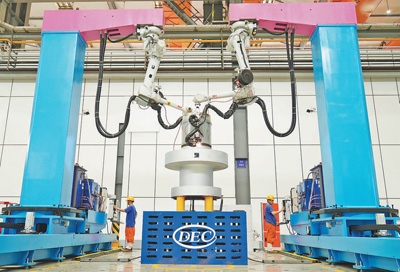 2022年葉片加工“黑燈產(chǎn)線(xiàn)”建成,葉片質(zhì)量合格率達(dá)99%,人均效率提升650%;在焊接數(shù)字化車(chē)間,依托智能機(jī)器人,一次焊接合格率接近100%。