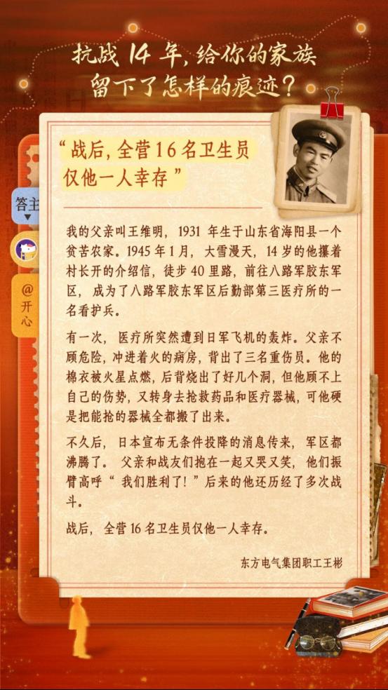 不久后,日本宣布無條件投降的消息傳來,軍區(qū)都沸騰了。父親和戰(zhàn)友們抱在一起又哭又笑,他們用振臂高呼“我們勝利了!”后來的他還歷經(jīng)了多次戰(zhàn)斗。戰(zhàn)后,全營16名衛(wèi)生員僅他一人幸存。