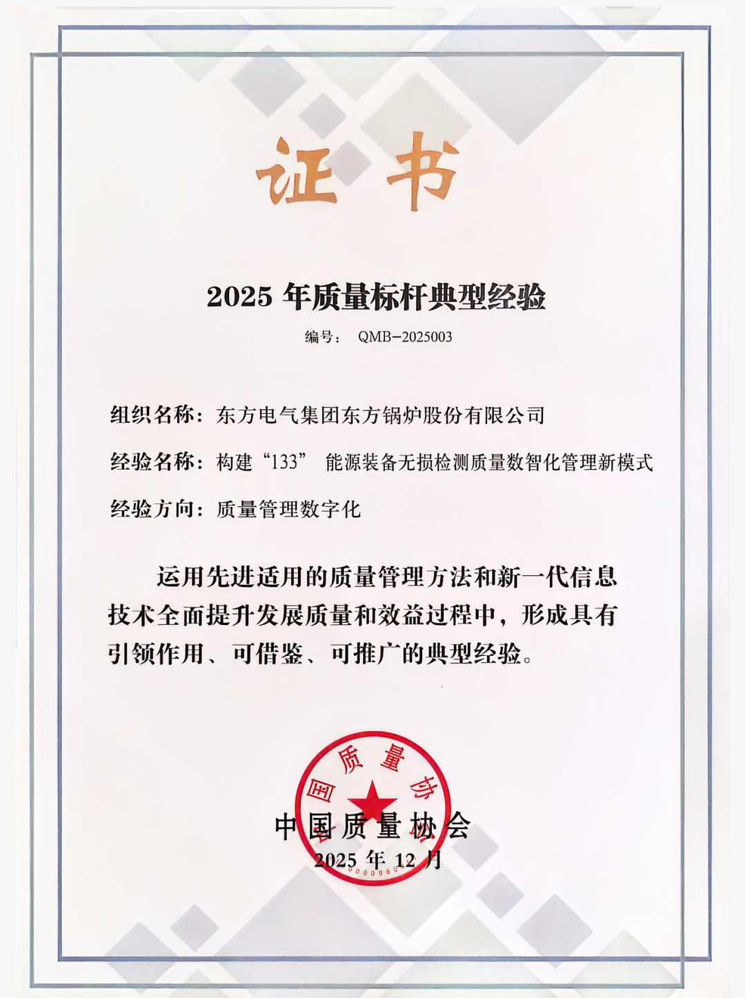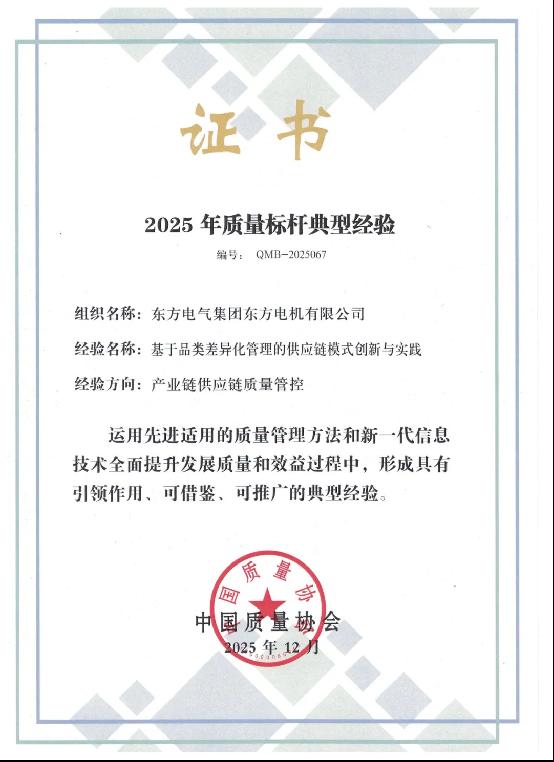 近日,中國質(zhì)量協(xié)會年會暨第三屆追求卓越大會順利舉行,東方電氣集團(tuán)再添質(zhì)量領(lǐng)域榮譽(yù),獲評中國質(zhì)量協(xié)會2025年全國質(zhì)量標(biāo)桿2項,質(zhì)量相關(guān)獎項12項,彰顯硬核品質(zhì)實力。