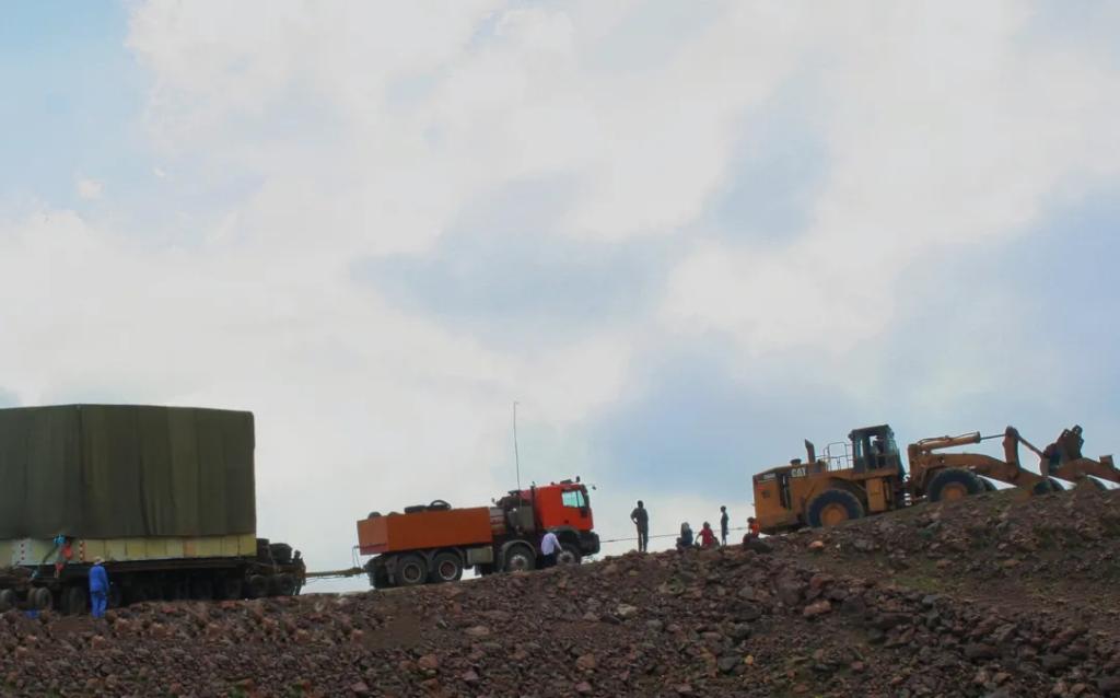 一切就緒,烏云密布的天空,宛如拉下了一塊巨大的黑色幕布。車輛嘶吼著前進(jìn),大馬力裝載機(jī)在車輛尾部“發(fā)狠”地往前推,轟鳴聲、摩擦聲、應(yīng)答聲……在異國他鄉(xiāng)上演著一場盛大的“交響音樂會(huì)”。