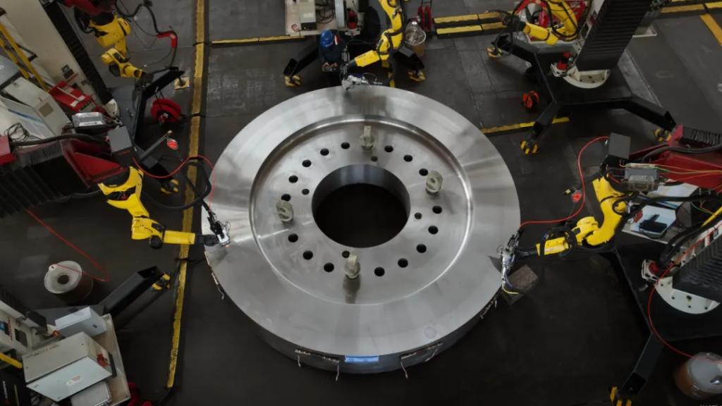 在轉(zhuǎn)輪的工藝制造上,采用機(jī)器人電弧增材制造(3D打?。┘夹g(shù),“打印”完成后,大圓環(huán)就會“長”出一片片水斗型“花瓣”,這道程序就是所謂的“鐵臂繡花”?!拌F臂繡花”不僅降低了鍛件制造難度,提高了材料利用率,還可以讓轉(zhuǎn)輪應(yīng)對極端情況。