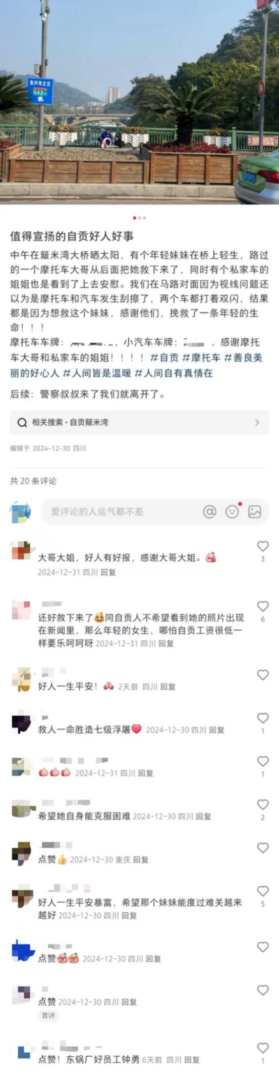 近日,在四川自貢簸米灣大橋上上演了暖心一幕:一位“摩托車大哥”挽救了一名意欲輕生的女孩。這一見(jiàn)義勇為的善舉被路人用鏡頭捕捉了下來(lái)。