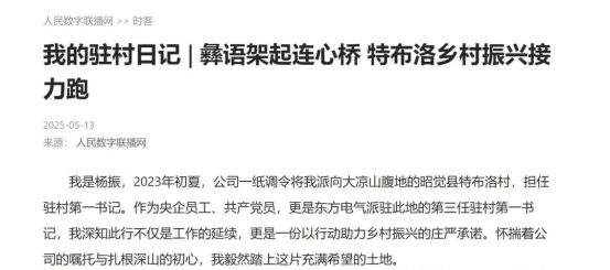 近日,“牢記囑托 駐村興農(nóng)”駐村第一書記交流會(huì)暨2025年版《駐村第一書記說》專欄發(fā)布會(huì)在北京人民日?qǐng)?bào)社舉行。東方電氣集團(tuán)應(yīng)邀參加,駐昭覺縣特布洛村第一書記楊振參會(huì),與來自全國(guó)10余個(gè)省份的駐村第一書記、專家學(xué)者、企業(yè)代表及媒體記者,就黨建引領(lǐng)、產(chǎn)業(yè)融合、數(shù)字化賦能等鄉(xiāng)村振興關(guān)鍵議題展開深入交流。