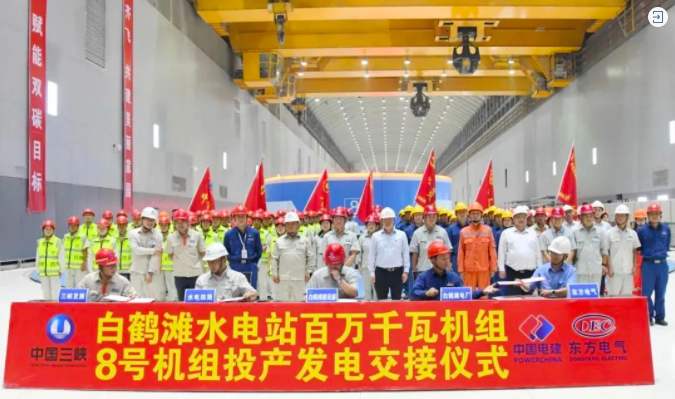 2022年9月22日,隨著8號(hào)機(jī)組完成72小時(shí)試運(yùn)行,金沙江白鶴灘水電站左岸全部8臺(tái)機(jī)組投產(chǎn)。至此,東方電氣白鶴灘項(xiàng)目研發(fā)制造、安裝服務(wù)任務(wù)圓滿收官。