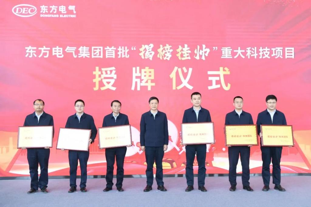 ▲2022年3月23日,東方電氣集團(tuán)舉行首批“揭榜掛帥”重大科技項(xiàng)目授牌及啟動(dòng)儀式,集團(tuán)公司黨組書記、董事長(zhǎng)俞培根向揭榜團(tuán)隊(duì)負(fù)責(zé)人授牌