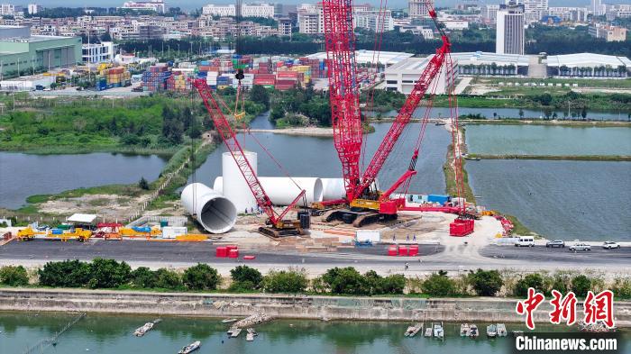 全球單機(jī)容量最大海上風(fēng)電機(jī)組正在廣東風(fēng)電臨海試驗(yàn)基地進(jìn)行塔筒吊裝。(廣東電網(wǎng)公司供圖)