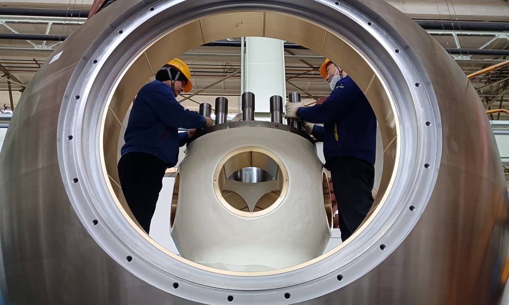 東方電氣集團工作人員在進行沙坪一級水電項目2號機組轉(zhuǎn)輪裝配。2025年以來,東方電氣已完成四川、安徽、內(nèi)蒙古等省多個水電項目機組部件產(chǎn)出。