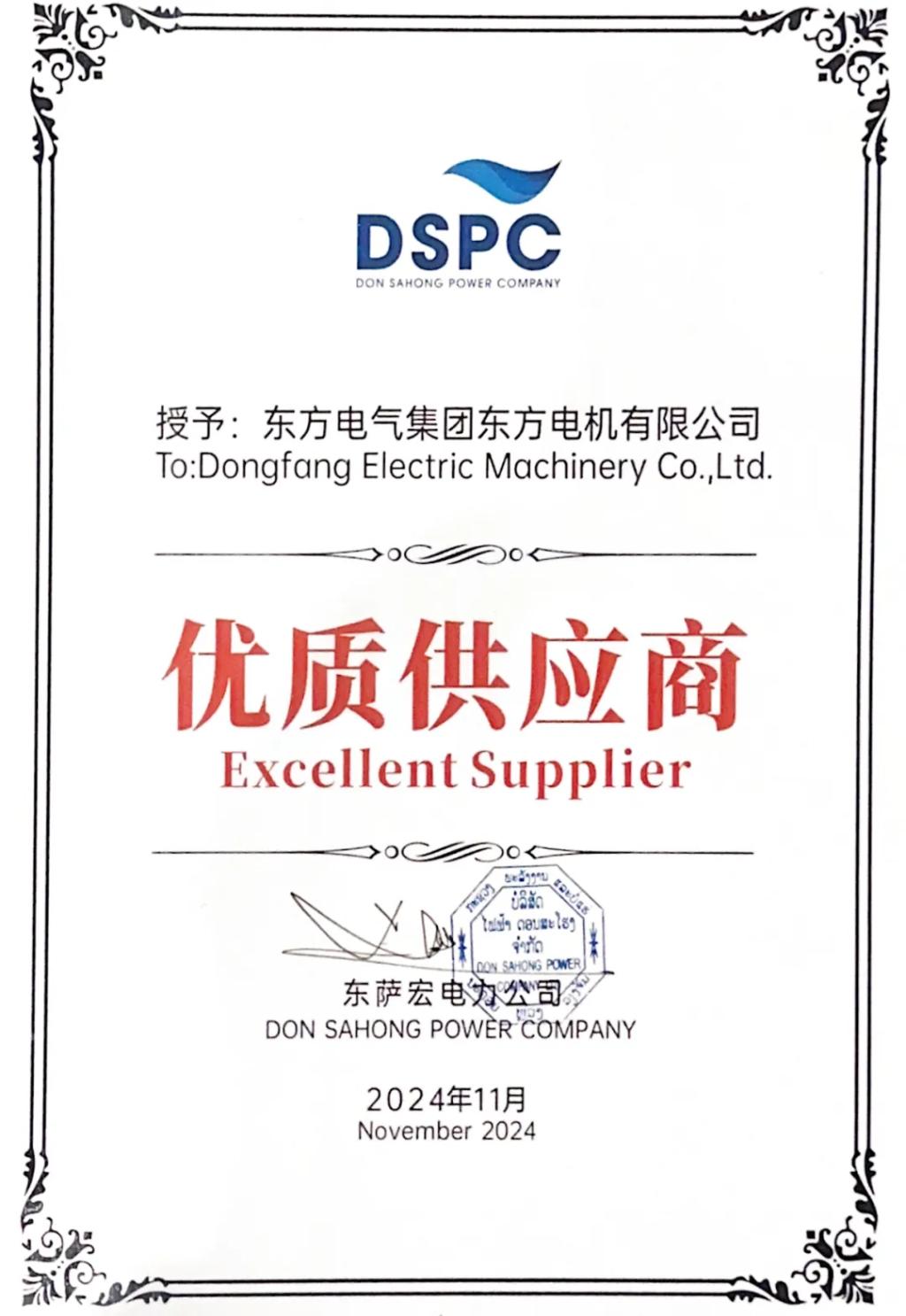 東薩宏電力公司向東方電機頒發(fā)的“優(yōu)質(zhì)供應(yīng)商”證書,是對機組運行優(yōu)異的最好證明。
