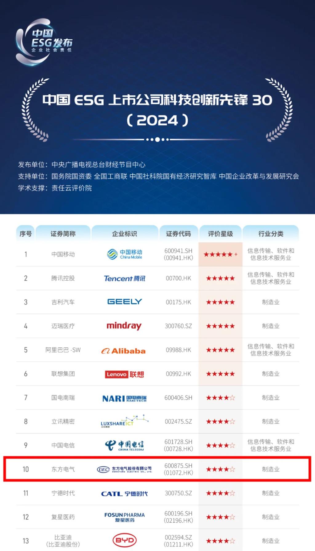 近日,由中央廣播電視總臺(tái)聯(lián)合國務(wù)院國資委、全國工商聯(lián)、中國社科院國有經(jīng)濟(jì)研究智庫、中國企業(yè)改革與發(fā)展研究會(huì)等權(quán)威機(jī)構(gòu)聯(lián)合推出的《科技創(chuàng)新ESG行動(dòng)報(bào)告(2024)》正式發(fā)布。東方電氣憑借在科技創(chuàng)新和ESG(環(huán)境、社會(huì)和公司治理)領(lǐng)域的卓越表現(xiàn),成功入選“中國ESG上市公司科技創(chuàng)新先鋒30(2024)”榜單,位列榜單第十位。