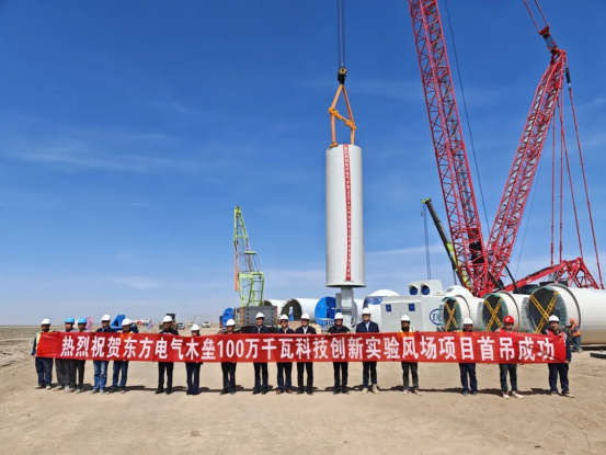 近日,在新疆木壘廣袤的戈壁灘上,由東方電氣集團所屬東方風電承建的東方電氣木壘100萬千瓦科技創(chuàng)新實驗風場順利完成首臺風機吊裝,以“硬核速度”交出又一答卷。