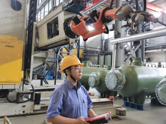 隨著“嗞”的電流聲響起,焊槍緩緩移動(dòng),生產(chǎn)制造部焊接骨干劉慶眉頭逐漸緊鎖,高度緊張,眼神緊盯焊點(diǎn),手握機(jī)械臂操控柄,挪著小碎步精細(xì)操作,完全顧不上自己踩在超150℃高溫的十米高的操作臺(tái)上。