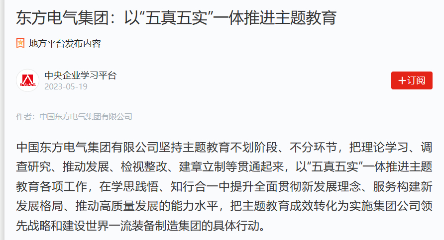 中國東方電氣集團(tuán)有限公司堅(jiān)持主題教育不劃階段、不分環(huán)節(jié),把理論學(xué)習(xí)、調(diào)查研究、推動發(fā)展、檢視整改、建章立制等貫通起來,以“五真五實(shí)”一體推進(jìn)主題教育各項(xiàng)工作,在學(xué)思踐悟、知行合一中提升全面貫徹新發(fā)展理念、服務(wù)構(gòu)建新發(fā)展格局、推動高質(zhì)量發(fā)展的能力水平,把主題教育成效轉(zhuǎn)化為實(shí)施集團(tuán)公司領(lǐng)先戰(zhàn)略和建設(shè)世界一流裝備制造集團(tuán)的具體行動。