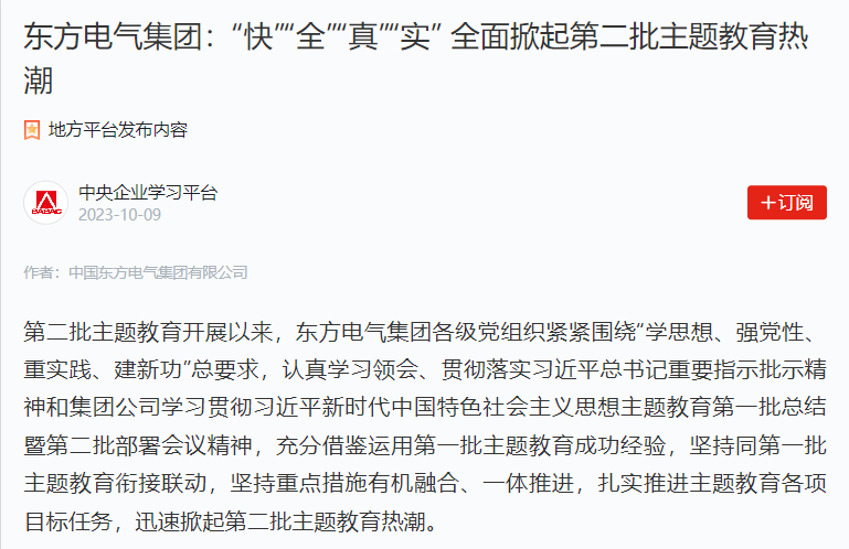 第二批主題教育開(kāi)展以來(lái),東方電氣集團(tuán)各級(jí)黨組織緊緊圍繞“學(xué)思想、強(qiáng)黨性、重實(shí)踐、建新功”總要求,認(rèn)真學(xué)習(xí)領(lǐng)會(huì)、貫徹落實(shí)習(xí)近平總書(shū)記重要指示批示精神和集團(tuán)公司學(xué)習(xí)貫徹習(xí)近平新時(shí)代中國(guó)特色社會(huì)主義思想主題教育第一批總結(jié)暨第二批部署會(huì)議精神,充分借鑒運(yùn)用第一批主題教育成功經(jīng)驗(yàn),堅(jiān)持同第一批主題教育銜接聯(lián)動(dòng),堅(jiān)持重點(diǎn)措施有機(jī)融合、一體推進(jìn),扎實(shí)推進(jìn)主題教育各項(xiàng)目標(biāo)任務(wù),迅速掀起第二批主題教育熱潮。