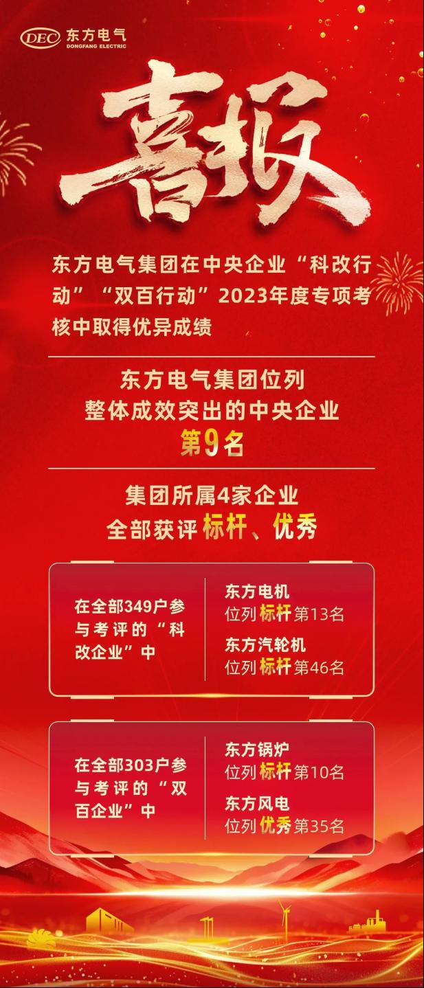 近本網(wǎng)訊 日,國(guó)務(wù)院國(guó)資委發(fā)布中央企業(yè)“科改行動(dòng)”“雙百行動(dòng)”2023年度專(zhuān)項(xiàng)考核結(jié)果,東方電氣集團(tuán)在推進(jìn)“科改行動(dòng)”“雙百行動(dòng)”整體成效突出的34家中央企業(yè)中位列第9名。東方電氣集團(tuán)所屬4家企業(yè)均取得優(yōu)異成績(jī),其中東方電機(jī)、東方汽輪機(jī)分別位列“科改行動(dòng)”標(biāo)桿企業(yè)第13名、標(biāo)桿企業(yè)第46名,東方鍋爐、東方風(fēng)電分別位列“雙百行動(dòng)”標(biāo)桿企業(yè)第10名、優(yōu)秀企業(yè)第35名。