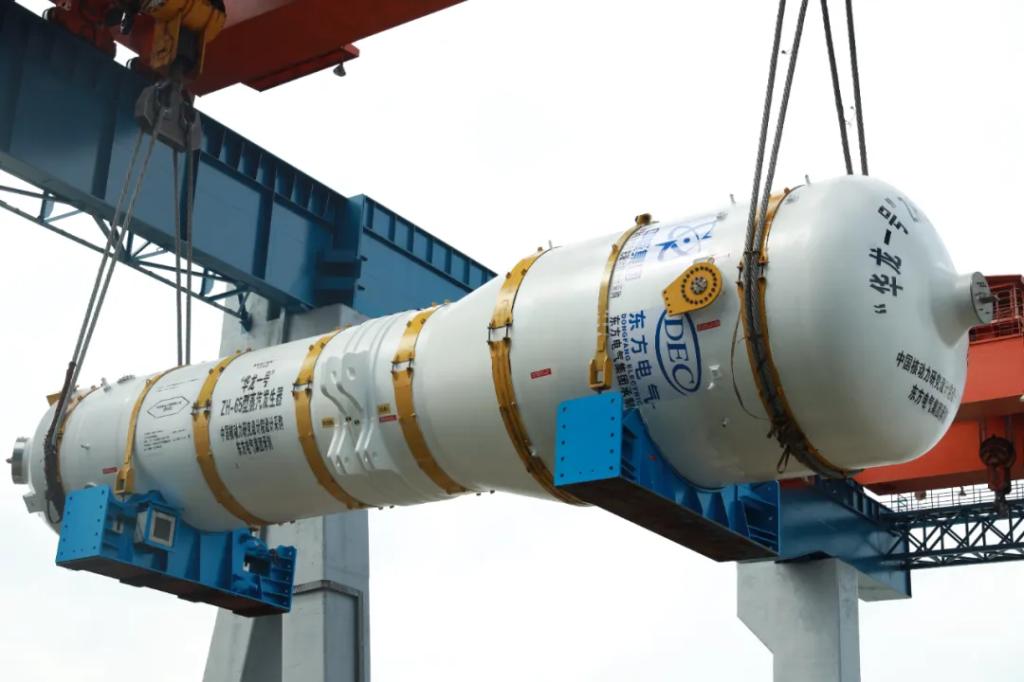 2017年10月17日,由集團(tuán)公司承制的全球首堆“華龍一號”蒸汽發(fā)生器在東方重機(jī)順利完工發(fā)運(yùn)。該設(shè)備重達(dá)390噸,高22米,功率1150兆瓦,標(biāo)志并見證著中國第三代核電設(shè)備自主設(shè)計制造能力的成熟。