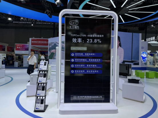 東方光能光伏組件系列產(chǎn)品,適用于分布式、地面電站、海上光伏等多應(yīng)用場(chǎng)景,本次參展的DEC自主品牌TOPCon 210N-66版型半片雙玻光伏組件,采用N型TOPCon電池技術(shù),發(fā)電功率最高達(dá)740瓦,轉(zhuǎn)換效率達(dá)到23.8%,電池技術(shù)和制造工藝位列行業(yè)前列,具有高發(fā)電量、低度電成本、高轉(zhuǎn)化效率、高可靠性、優(yōu)秀的抗衰減能力、綜合發(fā)電更優(yōu)等特點(diǎn)。